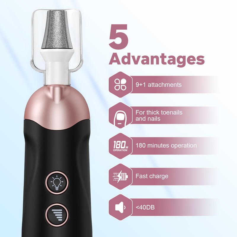 - Top Quality Torque with Safety Design: Designed for hand and foot care experience at home, the salon-quality electric nail file for women is suitable for trimming, grinding and polishing natural nails and thick nails. With an upgraded motor for more power, effective heat dissipation and low vibration, the electric nail grinder delivers a more comfortable and effective experience.
