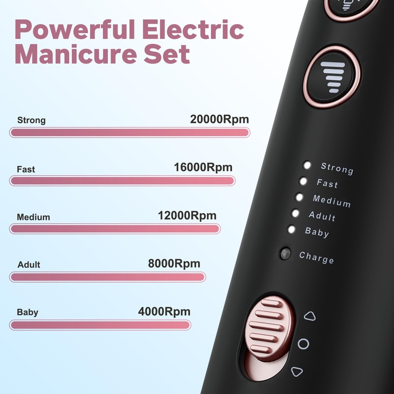 - Adjustable speeds and Direction for comfortable hand and foot daily care - 5 speed settings for 8000 to 20,000 RPM nail drill machine. You can use low speed for delicate areas and high speed for smooth corns and calluses. And the electric nail trimmer has 2 rotation directions, clockwise and counter-clockwise. It is easy to use no matter you are left-handed or right-handed.It is easy to use no matter you are left-handed or right-handed.