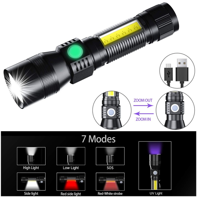- 【7 Beleuchtungsmodi & batteriebetrieben】Merkmale Hoch/Niedrig/SOS/UV/Weiß COB/Rot COB/ Rot und Weiß Blitz insgesamt 7 Arten von Beleuchtungsmodi, einfacher Moduswechsel durch leichtes Antippen der Taste. Die LED taschenlampe aufladbar ist klein und fein geformt, Größe 145*34 mm/117.6g, praktisch für tragbare Geräte, und die LED taschenlampe mit 2200mAh Batterie, kompatibel mit USB-Ladung.