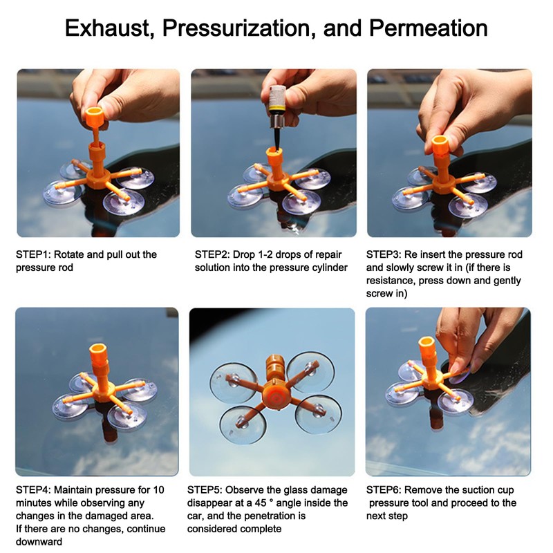 - Easy to use: The windscreen repair kit is easy to use. First clean the glass surface, fix the cracked area with a firm bracket, then pour the windshield repair kit into the pressure cylinder, press the pressure rod to press the repair fluid into the crack, put the car in the sun after 10-20 minutes, then remove with a knife.
