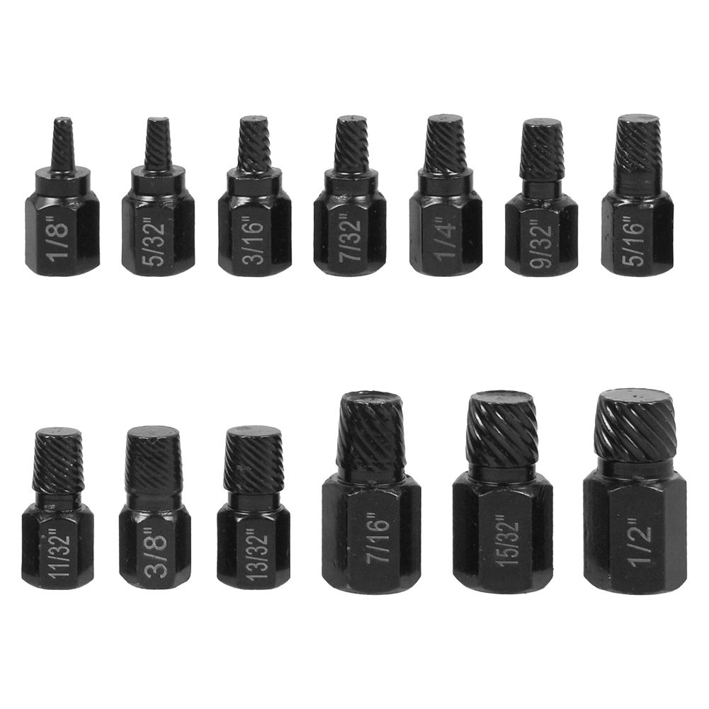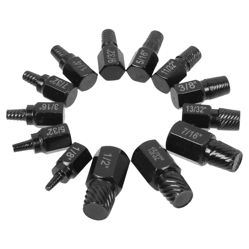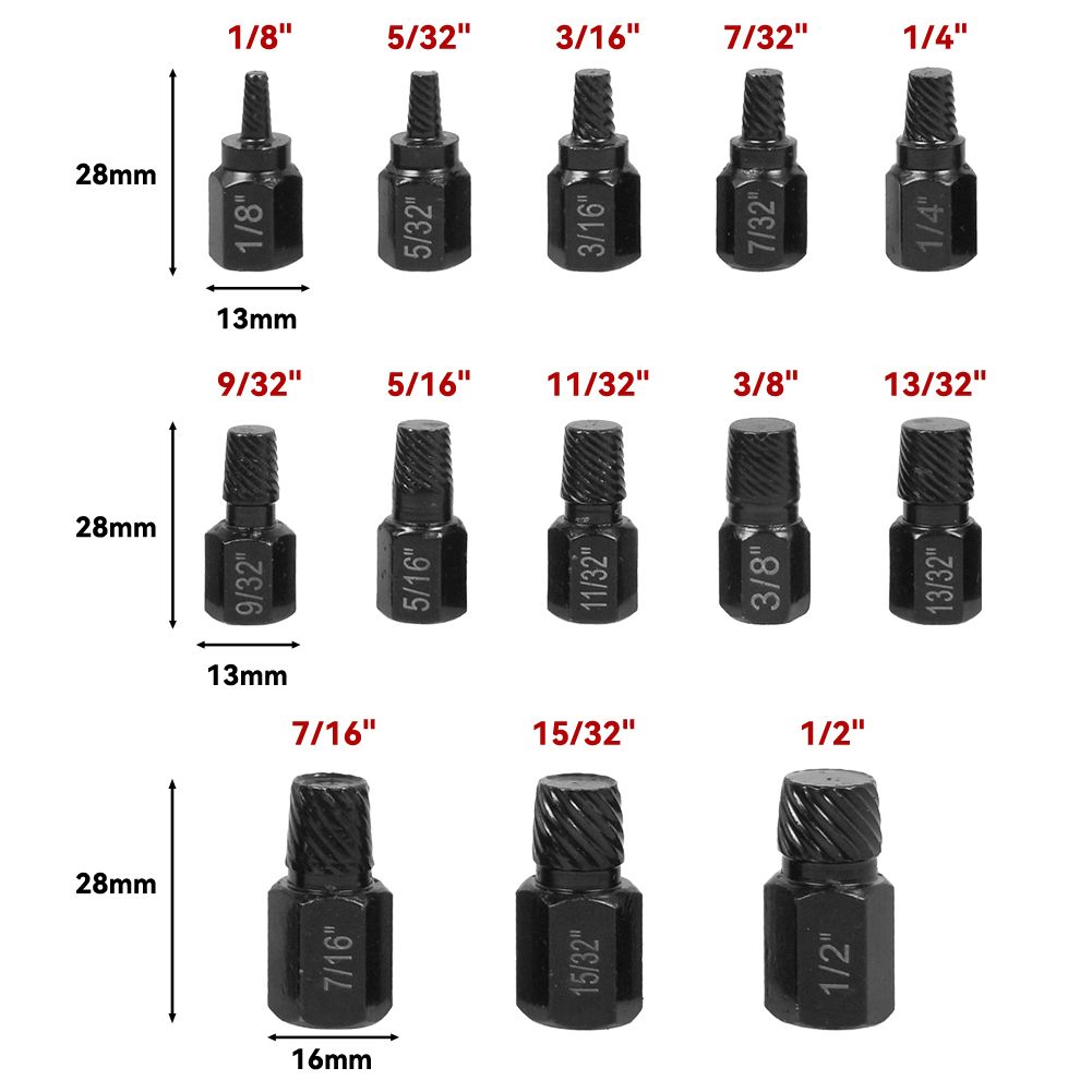 - The package includes 13 pieces of multi-spline screw extractors. And the specifications include 1/8 | 5/32 | 3/16 | 7/32 | 1/4 | 9/32 | 5/16 | 11/32 | 3/8 | 13/32 | 7/16 | 15/32 | 1/2 inch