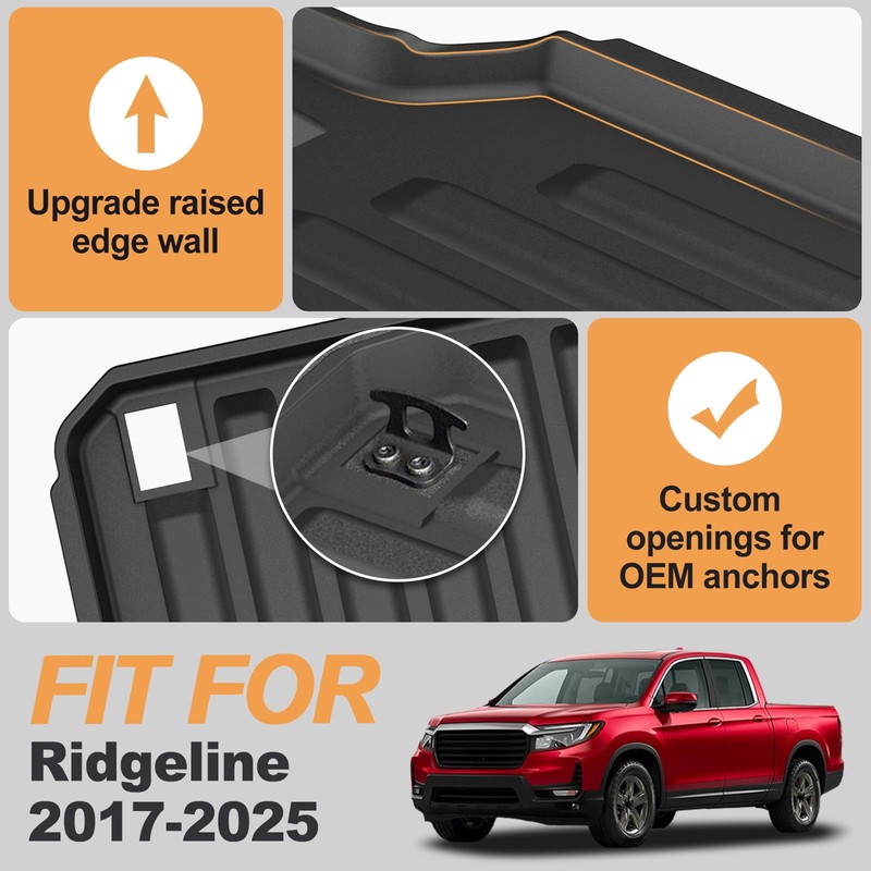 - 【CUSTOM FIT】 - Compatible with Honda Ridgeline 2017 2018 2019 2020 2021 2022 2023 2024 2025 5.3FT (64.0 inches), state-of-the-art 3D laser scanning technology ensures the great custom fit for your 2024 Ridgeline. AOMSAZTO truck bed mat is precisely tailored for your vehicle-specific floor carpets. Package includes: 2PCS, Ridgeline truck bed liner x1, tailgate mat x1.