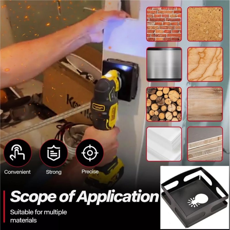 Make single gang rectangular holes in drywall for wall boxes such as High and Low-Voltage Tech, electrician, telephone, alarm/ security, CCTV/ IP camera, antenna, automation, home-theater, etc. Suitable for plasterboard, drywall, and wood. Please do not use for cutting cement walls, bricks, or hard metals.