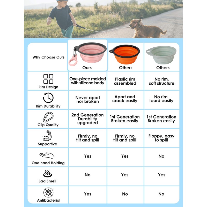 - 【Revolutionary Structure】Say goodbye to the hassle of assembled plastic rings. Aonkey's foldable dog bowl boasts an upgraded structure, integrating soft silicone with a hard rim. No more worries about the ring coming off or cracking, and the clip hole remains intact.