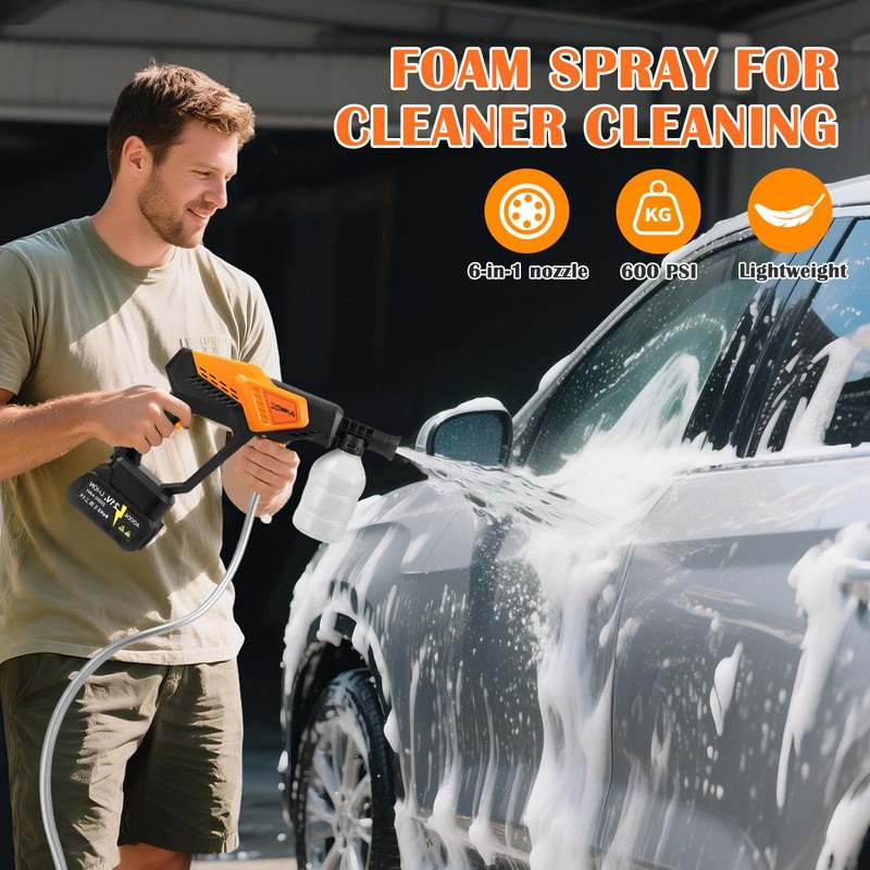 - 600PSI Pressure Power Cleaner: Cordless power washers are perfect for small jobs that don't require firing up the gasoline or plug-in electric pressure washer. Can provide working pressure up to 600PSI, it also includes a foam pot for efficient foaming, ideal for removing tough stains, Faster and deeper cleaning can be realized. Tips: Please keep your hand or people away from this water spout, it may get hurt