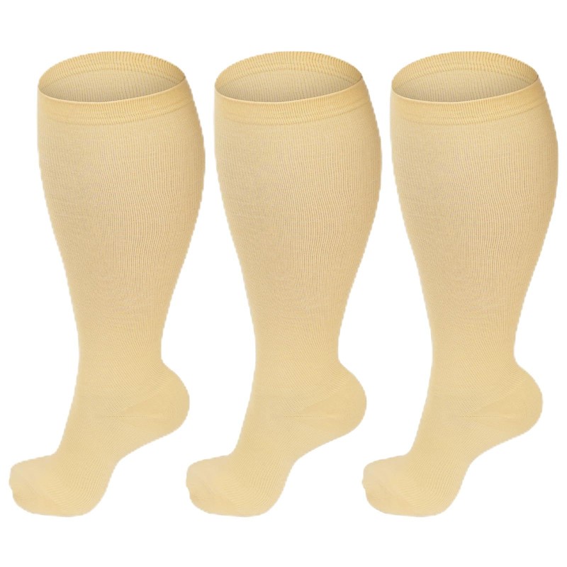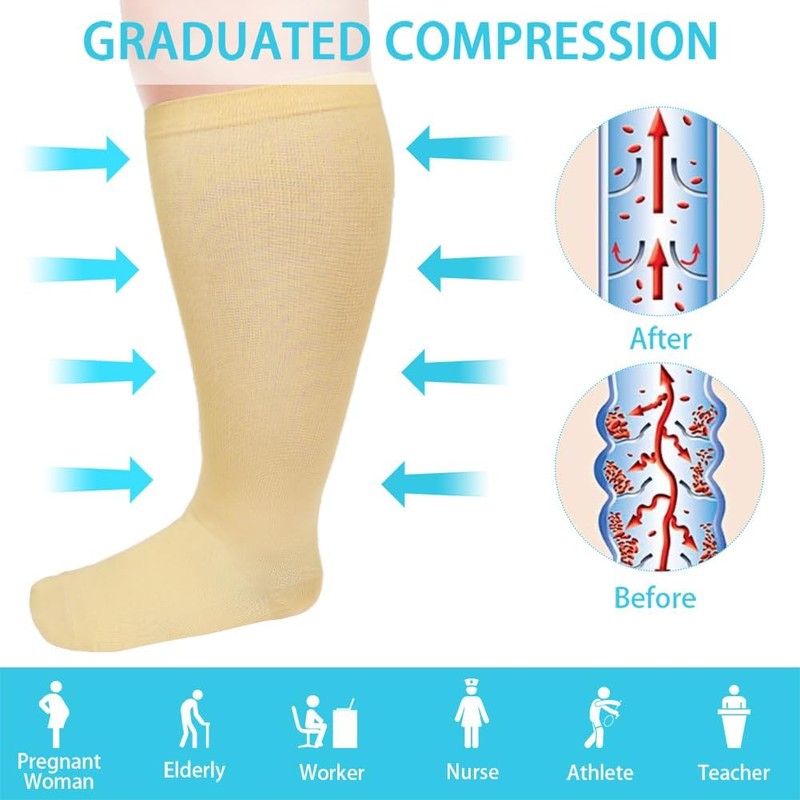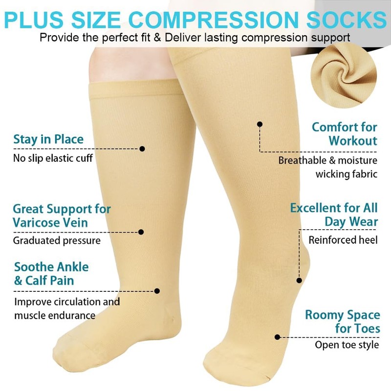 DescriptionAOOWU compression socks are improve blood circulation and reduce swelling, perfect for activities like traveling, sports, and working.Effectively Relieve Swelling and Pain: Compression socks can relieve symptoms of various circulatory and lymphatic system disorders, including varicose veins, spider veins, lymphedema, swelling, DVT, venous insufficiency, post-thrombotic syndrome, and CVI, improve blood circulation, reduce swelling and discomfort, increase energy, and support tired legs.Provide Optimal Comfort and Support: Wide-leg compression socks have excellent elasticity to ensure a comfortable fit. They provide the perfect amount of compression to enhance blood circulation, reduce swelling, and support your legs all day long.Breathable Material: Our compression socks for men and women are made of highly breathable material for optimal airflow and moisture wicking.Elasticity and Durability: Made of high-quality elastic material, these compression socks provide a snug fit that adapts to the unique contours of your legs. The durable design ensures that the socks retain their shape and compression even after multiple washes and long-term wear.Promote blood circulation: Our socks use graduated compression technology to effectively promote blood circulation in the legs. This helps reduce swelling, relieve fatigue and prevent the development of varicose veins.Applicable to:1. Compression socks are particularly beneficial for people who sit or stand for a long time.2. Compression socks can be worn during exercise, helping to prevent injuries and improve athletic performance.3. Ideal for pregnant women and plus-size people who need extra support and comfort.Specifications:Color: BlackSkin colorBlue gradientSize: 3XL, 4XL, 5XLPacking List: 3 Pair