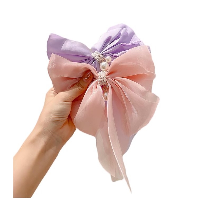 aoozleny 2Pcs Pearl Hair Bows for Women, Oversized Long Tail Hair Ribbons, Large Bow Hair Clip with Spring Clip Metal Clips Bowknot Hair Accessories (PinkPurple/cloth)