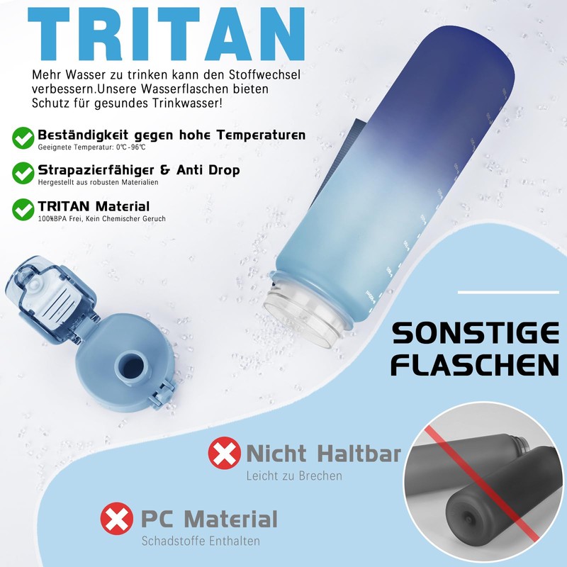 - 💪【SICHERHEIT & GESUNDHEIT】1L Trinkflasche besteht aus lebensmittelechtem Tritan-Material, das 100% BPA frei und ungiftig ist. Es hat 100% reinen Geschmack und bietet Ihnen ein geruchs- und geschmacksneutrales Trinkerlebnis.Leicht, langlebig und stoßdämpfend, macht es zu Ihrem idealen Begleiter in verschiedenen Lebenssituationen und unterstützt Ihren positiven und gesunden Lebensstil!