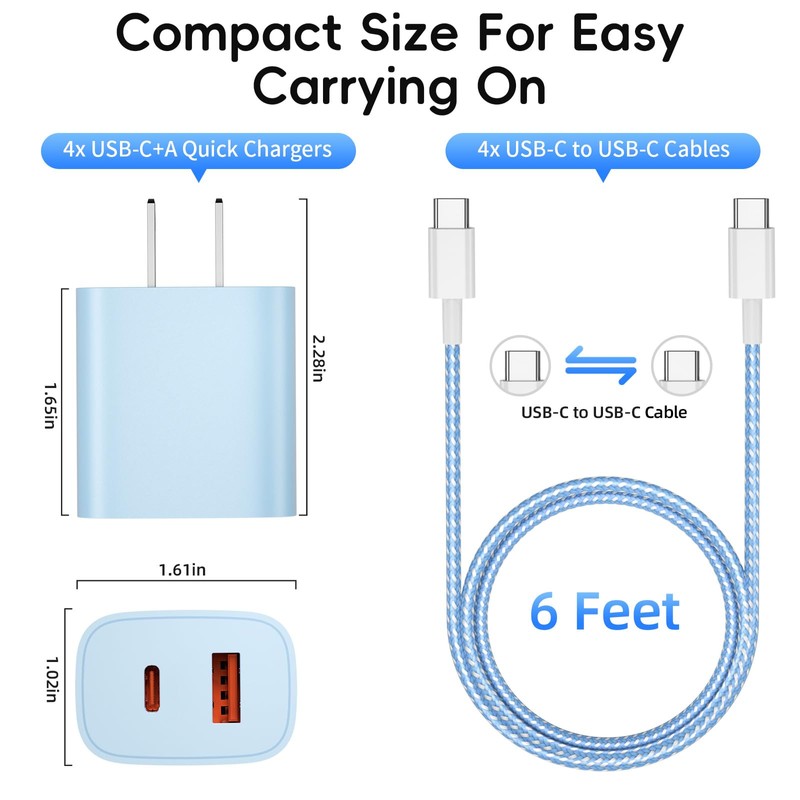 - [What You Get] 4-pack 20W Dual-Port Chargers, 4-pack 6 FT USB-C to USB-C cables (Note: Not included USB-A Cable). extremely compact size & travel-friendly design fits into your pocket or bag easily without occupying too much space. If you have any questions, please contact us!