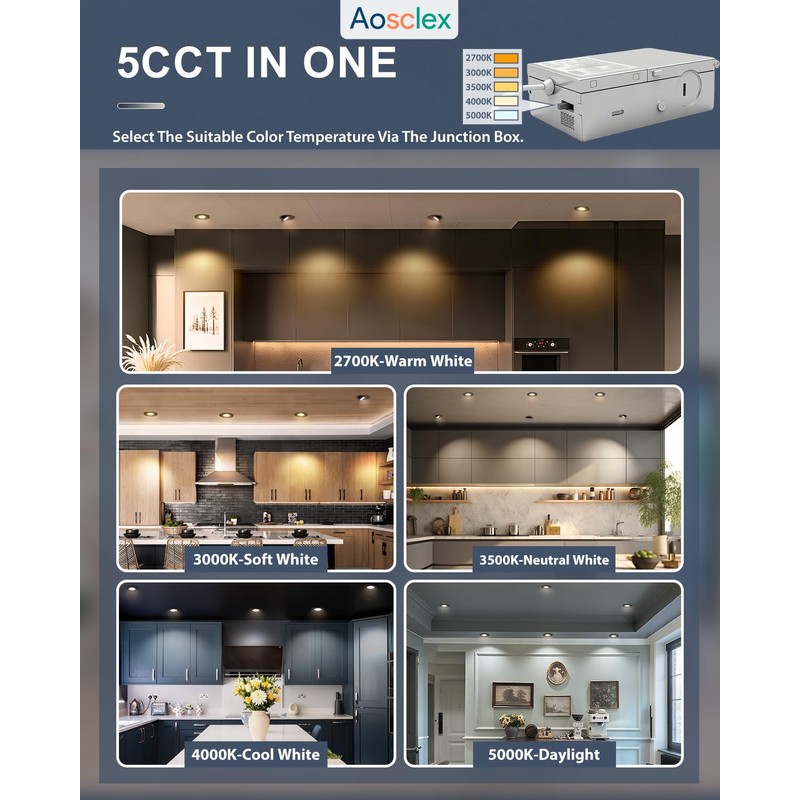 - 【5 CCT Options for All Ambiance】The LED recessed lights offer 5 selectable color temps: 2700K (warm yellow glow), 3000K (cozy warm white), 3500K (balanced neutral white), 4000K (crisp cool white), 5000K (natural daylight). No more guessing—slide the junction box switch to toggle in seconds. Avoids returns from wrong temps, fitting seamlessly in living rooms, kitchens, offices, bedrooms, etc.
