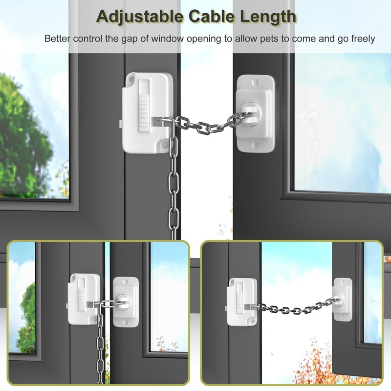 - Adjustable Window Restrictor No more worrying about the difficulty of controlling the opening distance. Depending on the size of your cat, you can adjust the length of the chain to determine the size of the gap for proper ventilation, while keeping your baby and cats safe inside. The gap size of 1-3/8" to 7-1/2" allows for far greater airflow than the Upvc window on the deadbolt.
