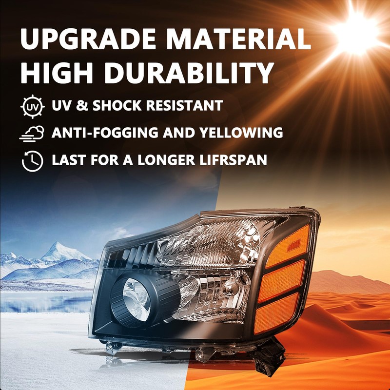 • 【VEHICLE COMPATIBILITY】These headlights compatible with 2004 2005 2006 2007 2008 2009 2010 2011 2012 2013 2014 2015 Nissan Titan.Fit for 2004 Nissan Pathfinder Armada and 2005 2006 2007 Nissan Armada. Light Source: Halogen