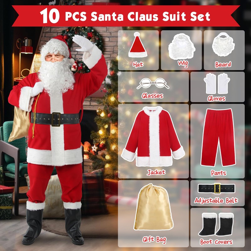 - 【10 PIECES COMPLETE SANTA SUIT 】This santa claus costume suit includes red plush santa coat, santa claus pants, belt, beard,wig, santa hat,gloves,glasses,gold gift bag and boots (Santa suit boots are designed to be worn over your own black shoes).
