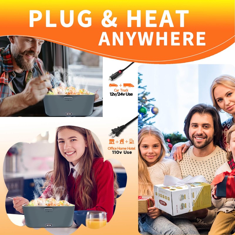 - ✅3-IN-1 HEATING LUNCH BOX: Enjoy hot meals on the go with our versatile food warmer lunch box, compatible with 110V/120V home/office outlets and 12V/24V car/truck adapters. Ideal for long work days on the road. Say goodbye to searching for microwaves and waiting in lines