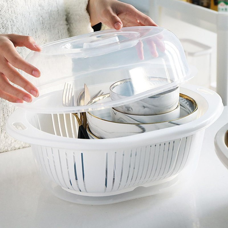AOVEEW Double Layer Draining Basket Efficient Storage and Draining Transparent Cover Kitchen Organizer (Small White)