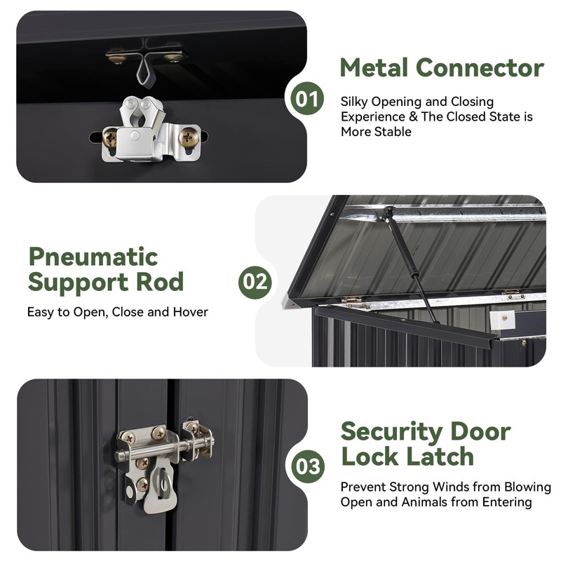 - Practical and Distinctive Design: This shed is equipped with a sturdy door bolt, ensuring the security of your belongings and preventing any potential loss. Its black color and appealing appearance seamlessly integrate with your gardens, backyards, patios, and more