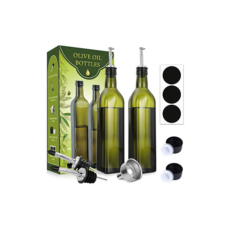 - ELEGANT OLIVE OIL DISPENSER SET - Glass olive oil bottle set with pour spouts with dust cap and flap cap, stainless steel funnel, three chalkboard labels, two inner corks and screws caps. Ideal for safely store and dispense your olive oil and vinegar to ensure your oils fresher for longer.