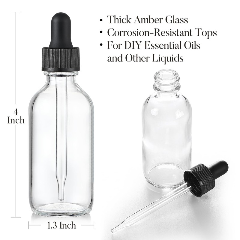 - ★Package Includes: 4 pack 1oz (30ml) clear glass eye dropper bottles + 1 stainless steel funnels + 4 labels. Size - 1.45 inch wide, 4.6 inch height.