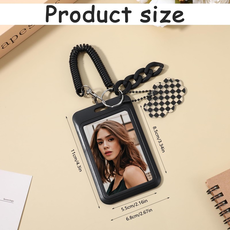 - Product information: the card holder is 11 x 6.8 cm and can hold two cards smaller than 8.5 x 5.5 cm. Accessories included in the package include a lobster clasp spring rope, 1 round ball chain, 1 acrylic open ring chain and 1 black and white plaid acrylic cloud motif.