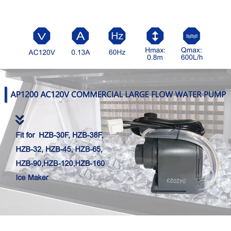 - Compatible With: AP1200 AC120V water pump compatible with HZB-30F, HZB-38F, HZB-32,HZB-45, HZB-65, HZB-90, HZB-120, HZB-160 ice maker