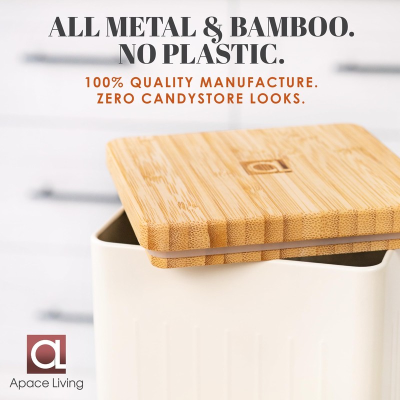 - ALLURING METAL AND BAMBOO DESIGN BEAUTIFIES ANY MODERN KITCHEN: Unlike regular plastic bread boxes, our metal bread canister gives you solid and durable storage with styling to brighten your home. Warm creamy white finish & natural bambo