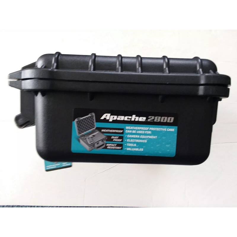 2800 Weatherproof Protective Case, Medium, Black, New. Protect Drone, Model Train Locomotives, Model Train Freight Cars, cameras, microphones, handguns and other specialized equipment with this exceptionally rugged APACHE® weatherproof storage case. Constructed from extremely durable polypropylene, this professional quality hard case takes a beating while protecting the contents from impact, moisture and microscopic dust. The built-in purge valve equalizes pressure so you can open the case after changing elevations.