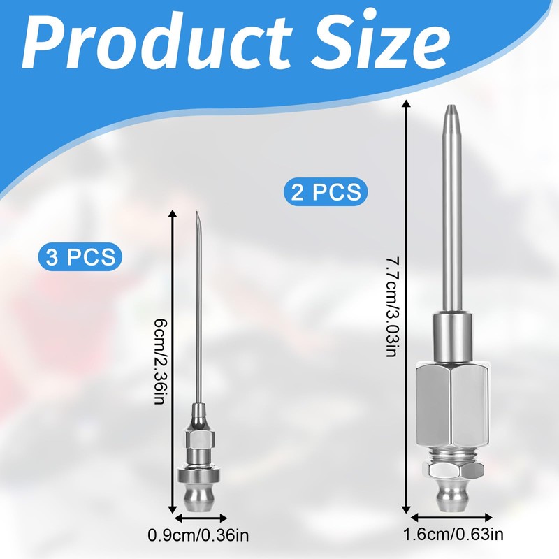 - PACKAGE INCLUDES: You will receive 2 piece of grease needle dispenser and 3 pieces of grease needle nozzles. The length of the grease needle dispenser and the grease injector needle measure about 7.7cm/3.03 inch and 6cm/2.36 inch.