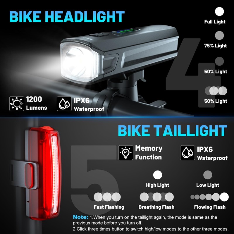- Strong Brightness: 1200 lumens super brightness bike headlight and a brighter bike rear light provide a increased visibility and safety for night riding. IPX6 waterproof function allows you to ride with confidence even in rain or snow