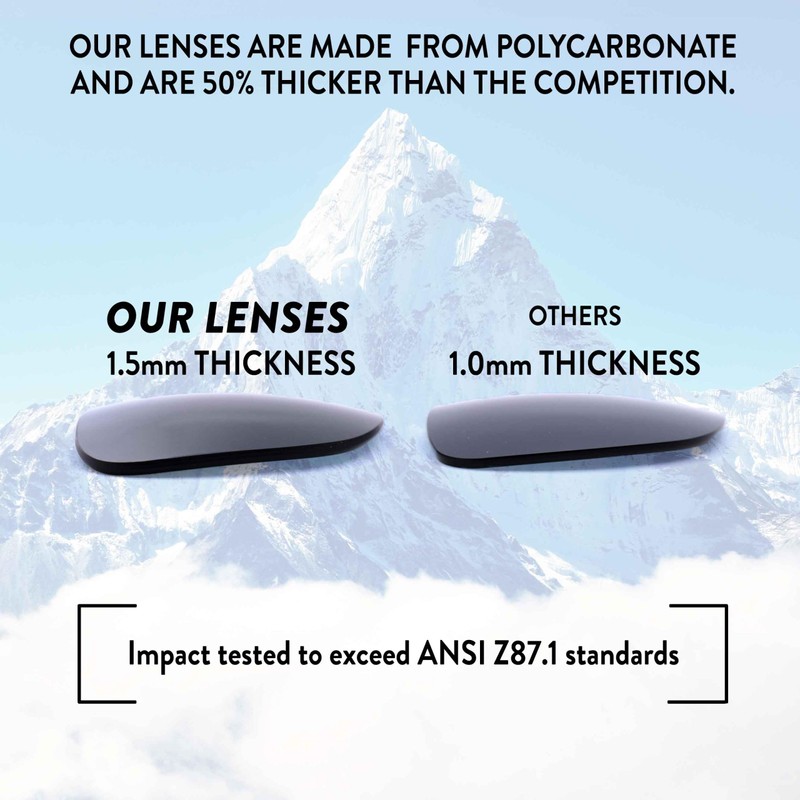 Apex Lenses are designed, tested and manufactured in the USA. We have unrivaled clarity, protection, and longevity than the other guys. We use only the highest quality materials and precision to keep your sunglasses at peak performance. Our lenses are 1.5mm thick, which are nearly identical to your original pair. We stand behind our products and offer a 30-day warranty from the purchase date. If you are unhappy for whatever reason, we will refund your purchase for the full amount.
