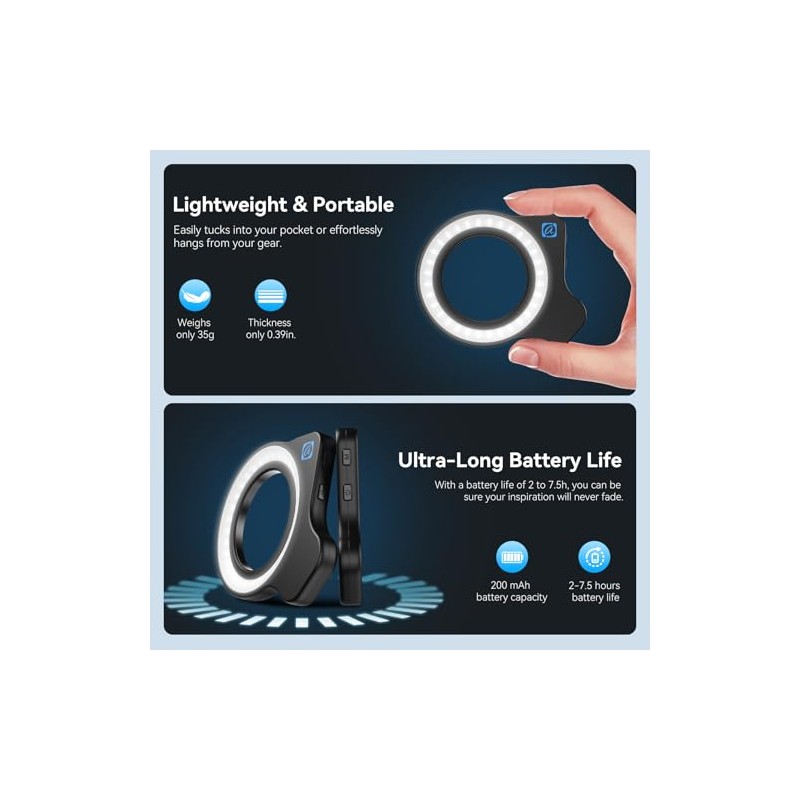 - Light Weight and Long Battery LifeThickness of the fill light is only 0.39 inches, weight is only 35 grams, compact and lovely, can be easily put into your pocket or hang on the device. Long battery life, 200 mAh lithium-ion battery, can last 2-7.5 hours on a single charge, supports charging while in use, providing you with a brilliant light source anytime, anywhere