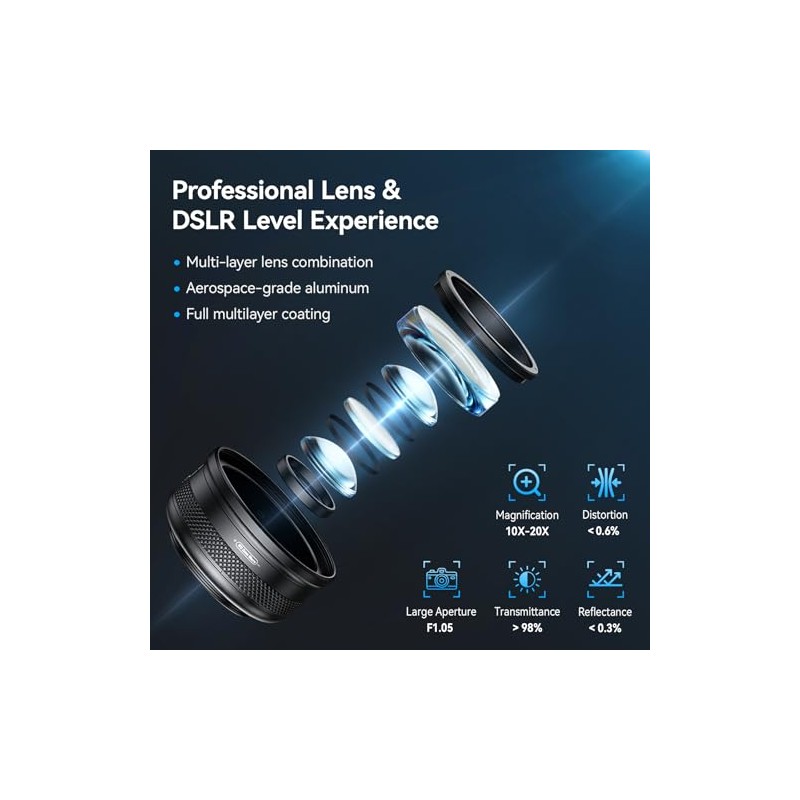 - 10-20X Precision ZoomAdopting ultra-precise rotating telescopic lens structure, it can realize 10-20X smooth zoom, enjoying the same operation experience as a DSLR camera and better capturing the details of the subject. Supports 0.6-inch ultra-close-up shooting to capture complex details more clearly. Super high image clarity, designed for macro photography enthusiasts, for cell phone still life close-ups on insects and plants, nail art and beauty details, jewelry, food, figure models and other small objects