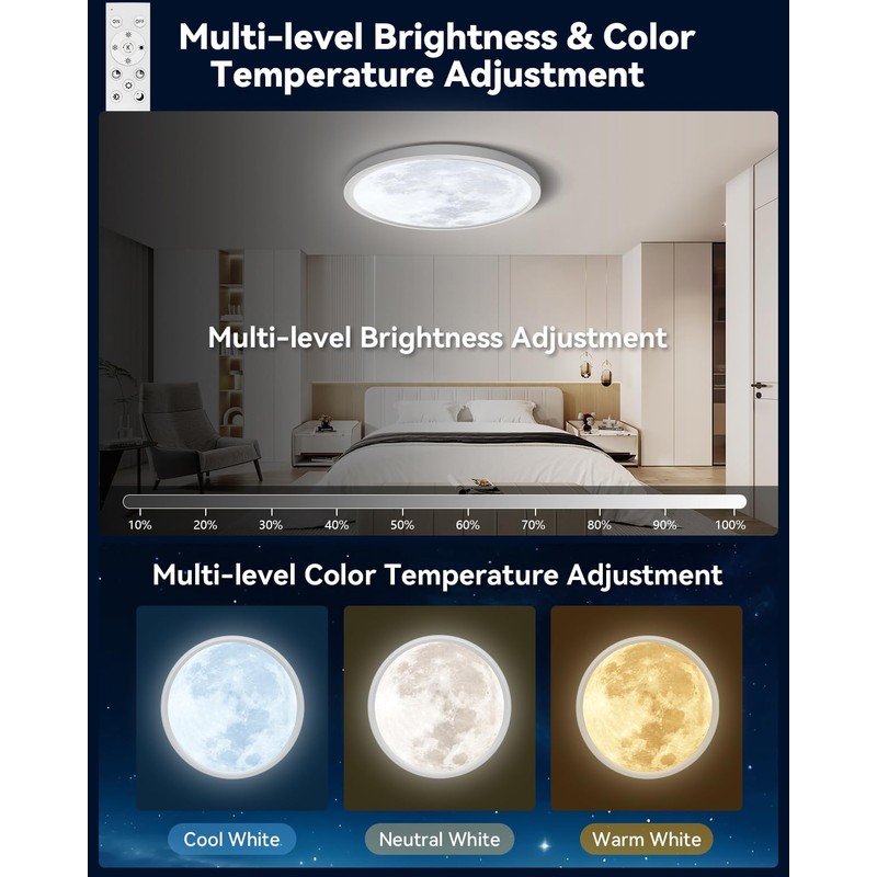 - 🎨【Dimmable & Adjustable Colour Temperatures】 Equipped with advanced 24W LEDs delivering 2800 lumens, this dimmable moon ceiling light allows smooth brightness adjustment from 10%–100%. Choose from 3000K warm white, 4000K neutral white, or 6500K cool white to suit your mood. Easily control settings with the remote or app to create personalised lighting scenes