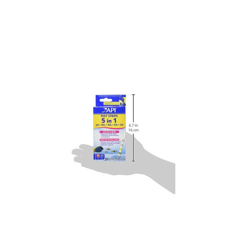 Keep your fish healthy and thriving by testing your aquarium water regularly with easy-to-use API 5-in-1 TEST STRIPS. API 5-in-1 TEST STRIPS for freshwater and saltwater aquarium help fish owners measure levels of Nitrite, Nitrate, Carbonate & General Hardness, and pH found in aquarium water. In order for fish to thrive, water must be similar to that which could be found in their natural environment. Poor water quality can cause fish stress, illness and even death. Just dip a strip directly into your aquarium and use the color-coded chart to determine if your water is safe, or if adjustments are needed. Then follow the recommendations to treat the water C its that simple. With API Aquarium products, its easy to keep a beautiful saltwater, freshwater or reef aquarium. For over 50 years, API has been creating innovative, research-driven solutions that make it easier to care for your fish and aquarium. API Aquarium Treatment Supplies are designed to work in conjunction with each other to provide best results to control algae, promote healthy bacterial growth and help control and cure fish diseases and conditions such as ich and fin rot. They work to provide a safe, hospitable environment for fish such as tropical community fish, cichlids, goldfish and more. With API, you can spend more time admiring your fish, and less time scrubbing your tank. Make sure to use all products as directed in order to ensure the best results.