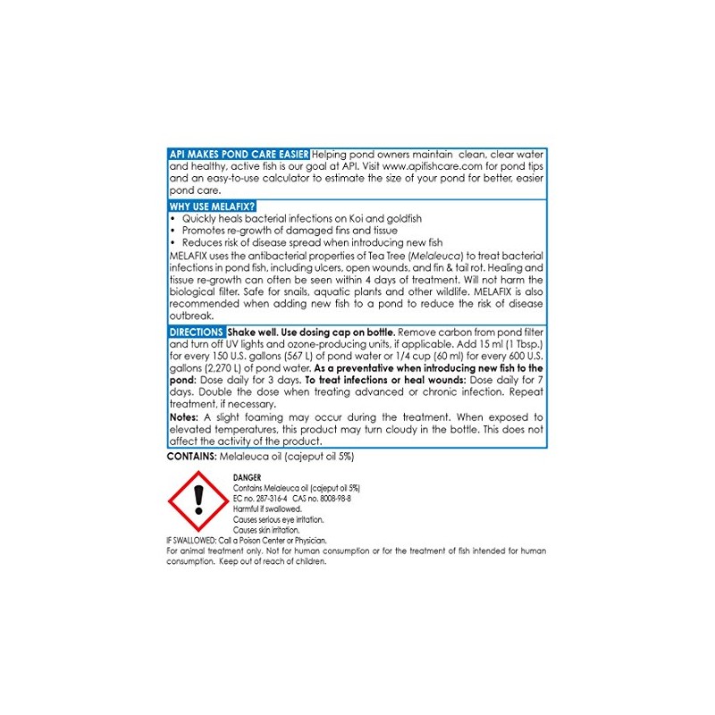 API POND MELAFIX Pond Fish Infection Remedy uses the properties of tea tree (Melaleuca) to treat infections in pond fish, including ulcers, open wounds, and fin and tail rot.