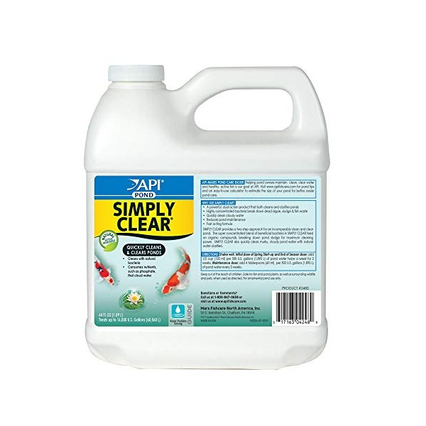 - Contains one (1) API POND SIMPLY CLEAR Pond Water Clarifier 64-Ounce Bottle