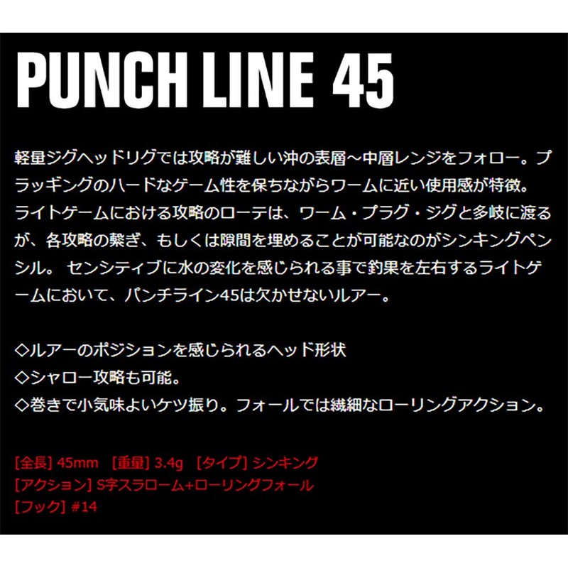 - Apia Punch Line 45 (Salt Lure); Weight: 0.1 oz (3.4 g); Type: Sinking; Action: S-shaped slalom + rolling fall; Hook: #14 (Apia Salt Lure)
