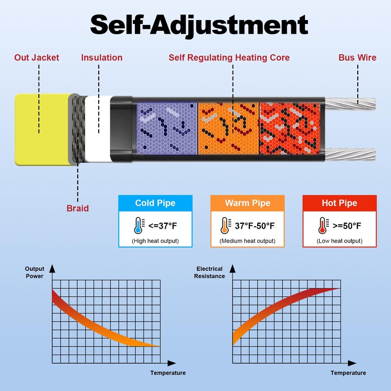 - Reliable Freeze Protection: The freeze protection feature provides dependable protection for both metal and plastic pipes, helping maintain water flow in harsh winter conditions. The self-regulating temperature technology optimizes heating performance, preventing overheating.