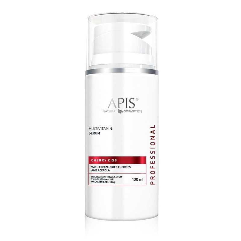 APIS Cherry Kiss Multivitamin Serum with Lioplisated Cherries and Acerol 100 ml For all skin types, especially sensitive and vascular skin. Cherry serum is based on freeze-dried cherry extract, cherry oil with high vitamin content of groups B, A and E and acerole. The serum also contains hyaluronic acid and amino acids. Thanks to the ingredients used, the serum minimises wrinkles and has an antioxidant effect. In addition, moisturises, increases the elasticity of the skin, regenerates and stimulates it to an intensive renewal. *The freeze-dried cherries retain their regenerating and antioxidant properties in addition to the unique aroma. Capacity: 100 ml