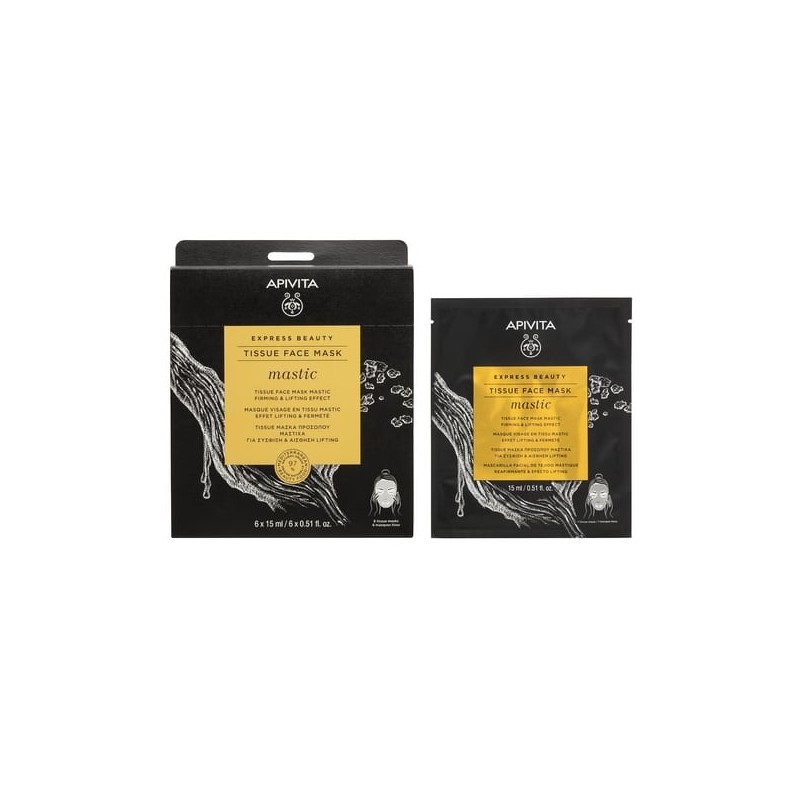 Apivita Express Beauty Tissue Face Mastic Firming & Lifting is an ultra-fine, soft, translucent, biocellulose fabric face mask, impregnated with a super-enhanced mastic serum and Mediterranean ingredients that enhances its elasticity and firmness.