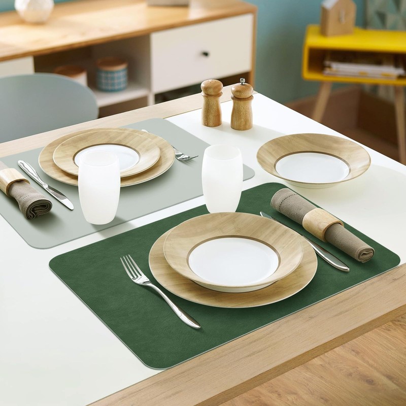 - Dual-Sided Placemats: The place mats are designed with a double-sided leather pattern, which gives them beauty and non-slip ability. They add a pop of color to your kitchen or dining room decor.