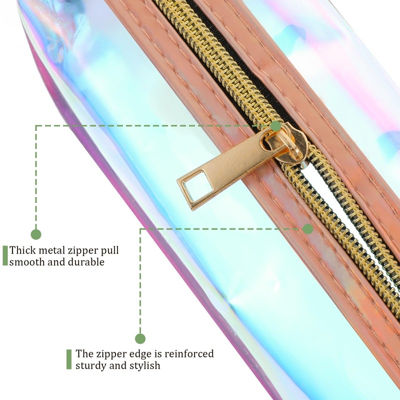 - 【Translucent for Easy Access】The iridescent bag with zipper are translucent, allowing you to see the contents at a glance. This feature makes it easy to find what you need quickly, whether you're on vacation, at the gym, or simply organizing your daily essentials.