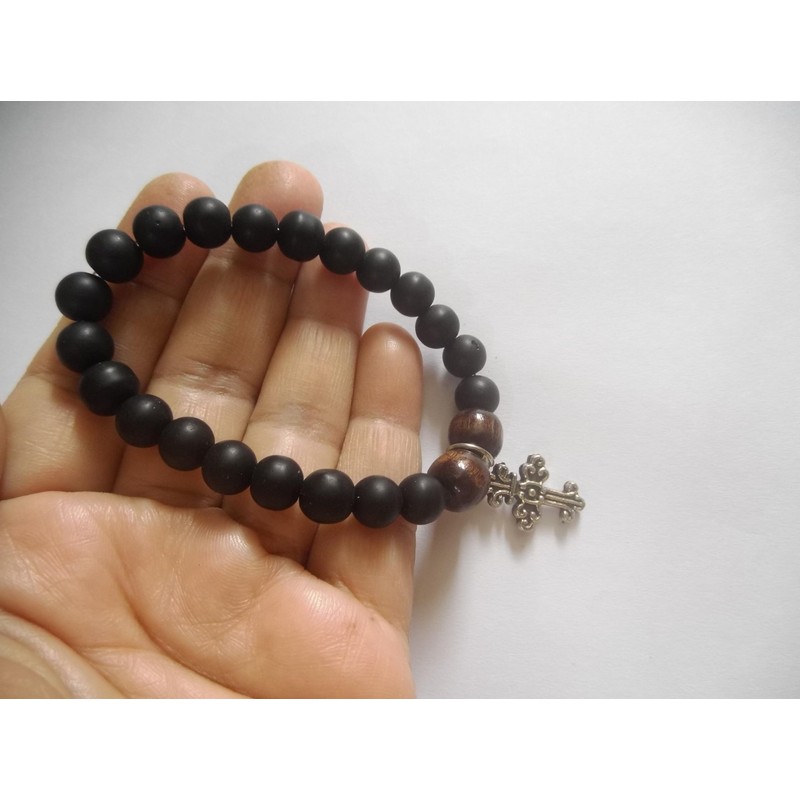 - Stylish Design: Featuring a striking black beaded bracelet with a beautiful cross hanging charm nestled between two wooden beads.