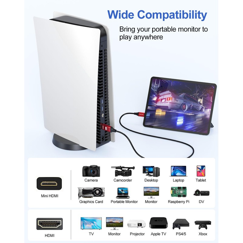 - 【4K Mini HDMI Bi-Directional Transmission】Mini HDMI to HDMI Cable 3.3ft/1m supports the transmission of high-definition audio and video through Mini HDMI port (e.g. digital camera, camcorder, tablet, graphics card, portable monitors, mini projectors or other devices that support Mini HDMI) to HDMI port (e.g. TV, monitor, projector, laptop, Xbox, PS4/PS5), and also supports HDMI to Mini HDMI transmission