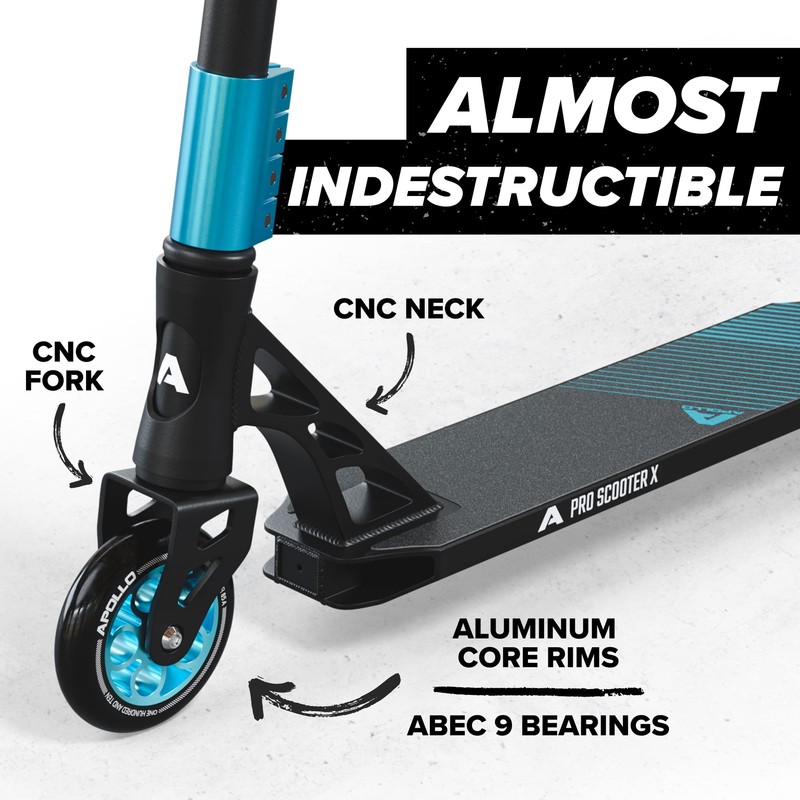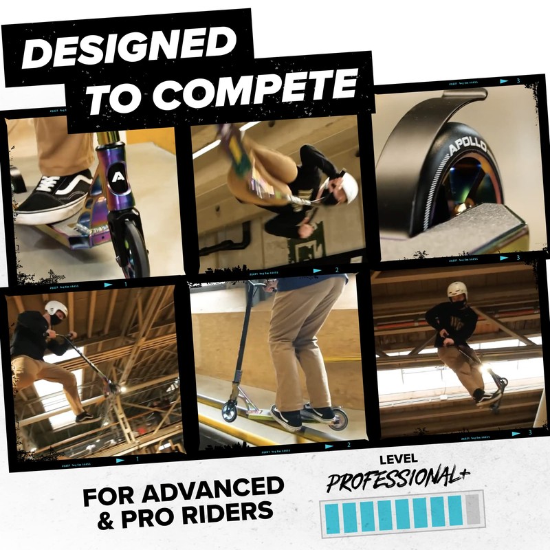 - ๐ค SPECIALLY DESIGNED STUNT SCOOTER: The APOLLO Genesis Pro X/Genesis Pro X Competition stunt scooter is specially designed for indoor and outdoor skate parks, for half pipes, rails, stairs, pools and kickers. The trick scooter is extremely stable, reinforced with a 360ยฐ Chrome Steel T-bar, so riders can ensure they are ๐๐ฎ๐ณ๐ฒ ๐ฎ๐ป๐ฑ ๐๐๐ฝ๐ฝ๐ผ๐ฟ๐๐ฒ๐ฑ ๐๐ต๐ถ๐น๐ฒ ๐ฑ๐ผ๐ถ๐ป๐ด ๐๐๐๐ป๐๐ ๐ฎ๐ป๐ฑ ๐๐ฟ๐ถ๐ฐ๐ธ๐. This pro scooter is perfect for jumps, grinds, turns, twists, and complicated stunts