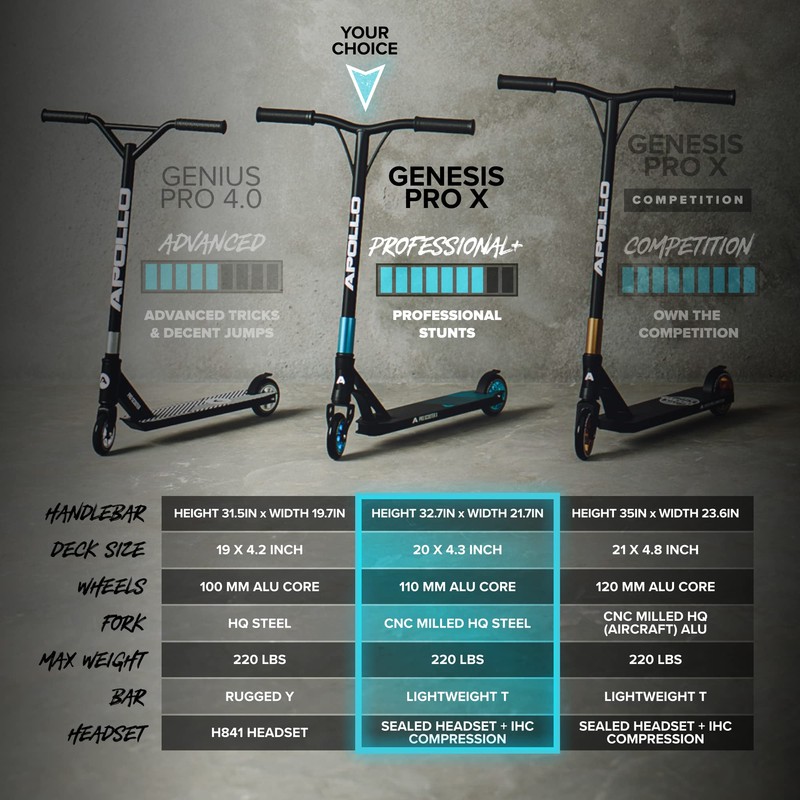 - ๐ด FREESTYLE AND EVERYDAY COMPANION: Your new APOLLO Genesis Pro X/Genesis Pro X Competition stunt scooter is perfect for freestyling at the skatepark, riding with your friends in the driveway or to get to school. As you fly down the street, you will always have the wind at your back. This pro stunt scooter gets you as much from point A to point B as it can ๐ธ๐ฒ๐ฒ๐ฝ ๐๐ฝ ๐๐ถ๐๐ต ๐๐ผ๐๐ฟ ๐๐ฐ๐ผ๐ผ๐๐ถ๐ป๐ด ๐ถ๐ฑ๐ฒ๐ฎ๐, choreographies and first stunts.