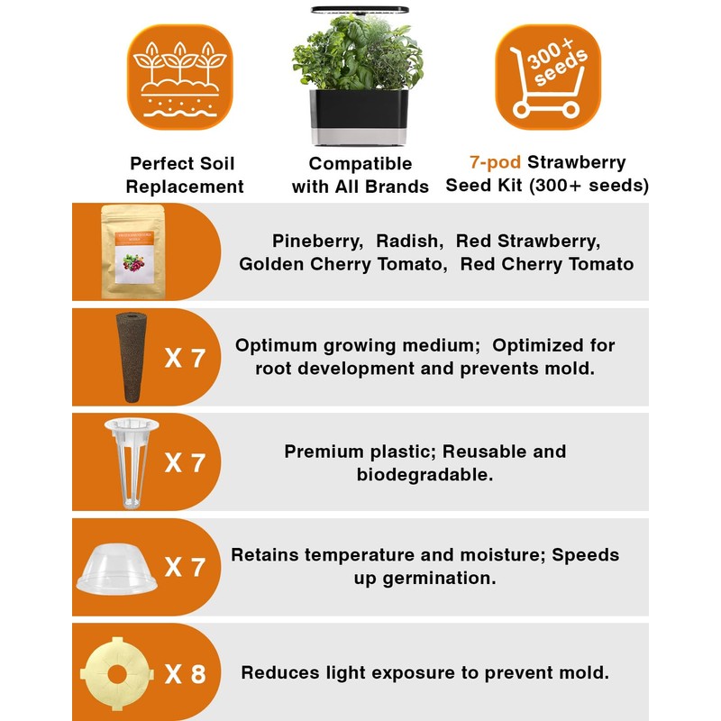 - Has All You'll NeedThis strawberry seed pod kit comes with everything you'll need for your hydroponics garden: 5 types of strawberry hydroponic seeds (Red Strawberry, Radish, Pineberry, Red Heirloom Cherry Tomato, Golden Harvest Cherry Tomato), 7 grow sponges, 7 growing domes, 7 planting baskets, 7 pods labels, and A&B Plant Nutrients. Get this kit and gain endless harvests.