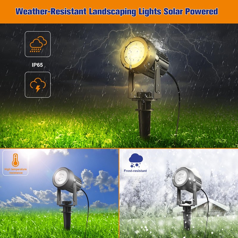 - 【Excellent waterproof effect】IP65 waterproof,landscape lighting solar can withstand rain and snow, and at the same time, it is resistant to high temperature and dust, so you don't have to worry about rain or other foreign objects entering the lamp head. Solar spot lights with excellent stability and durability,longer working time