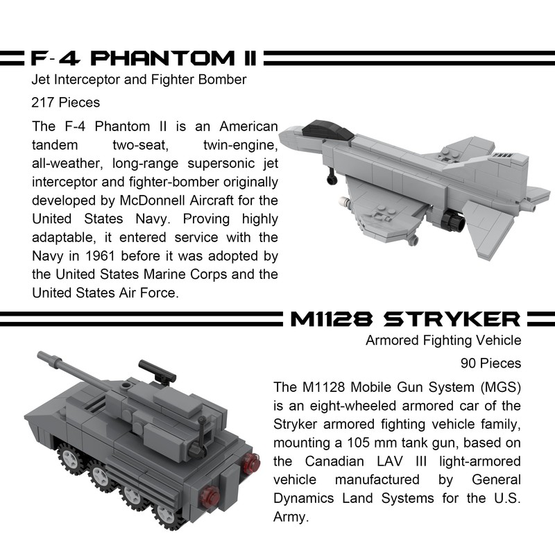 - Cada vehículo tiene piezas móviles. : avión de ataque A-10 Thunderbolt II, caza/bombardero F-4 Phantom II, vehículo de combate de infantería M109 Paladin, vehículo de combate blindado M1128 Stryker, avión de transporte militar V-22 Osprey