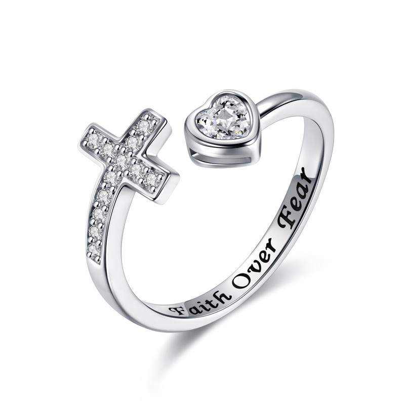 - Engraved Faith Over Fear, this heart ring shows the faith and love that Christ has for you. silver cross ring with heart cut cubic zirconia stone.