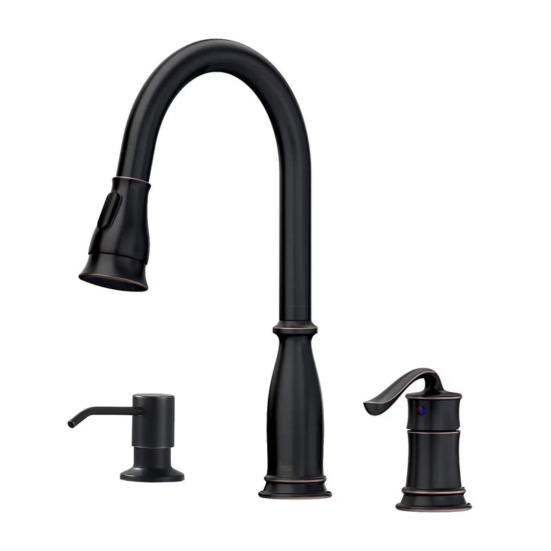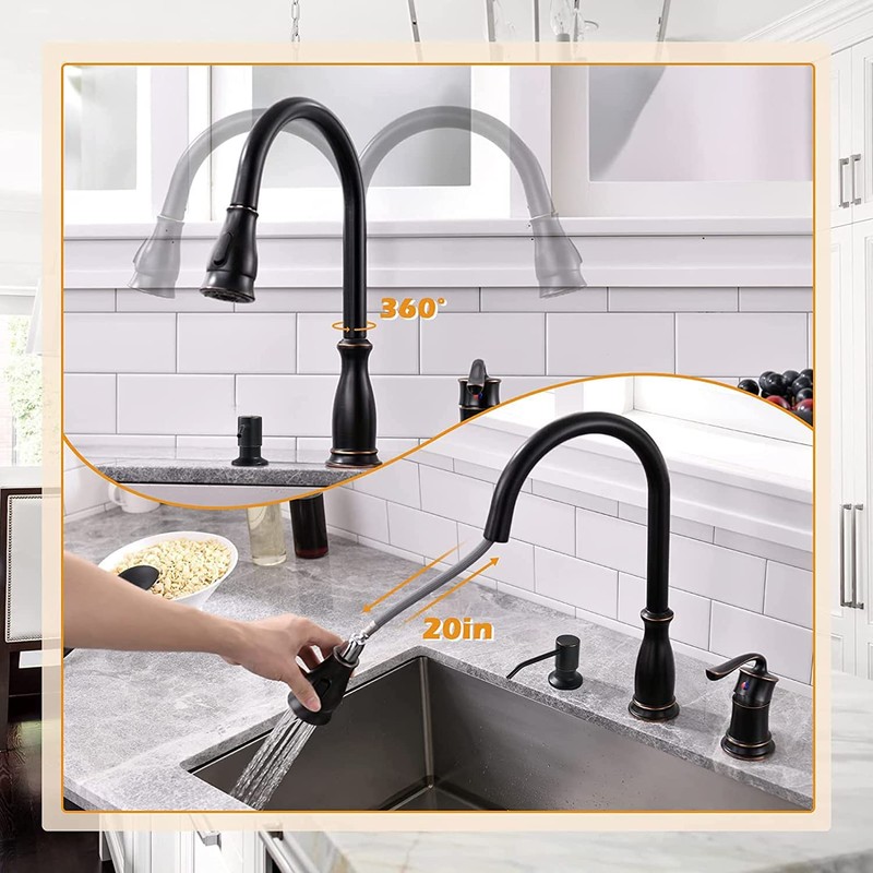 APPASO 3 Hole Pull Down Kitchen Faucet with Sprayer Oil Rubbed Bronze, 3 Pieces Pull Out Kitchen Sink Faucet with Side Single Handle with Soap Dispenser, Antique Bronze, APS218ORB